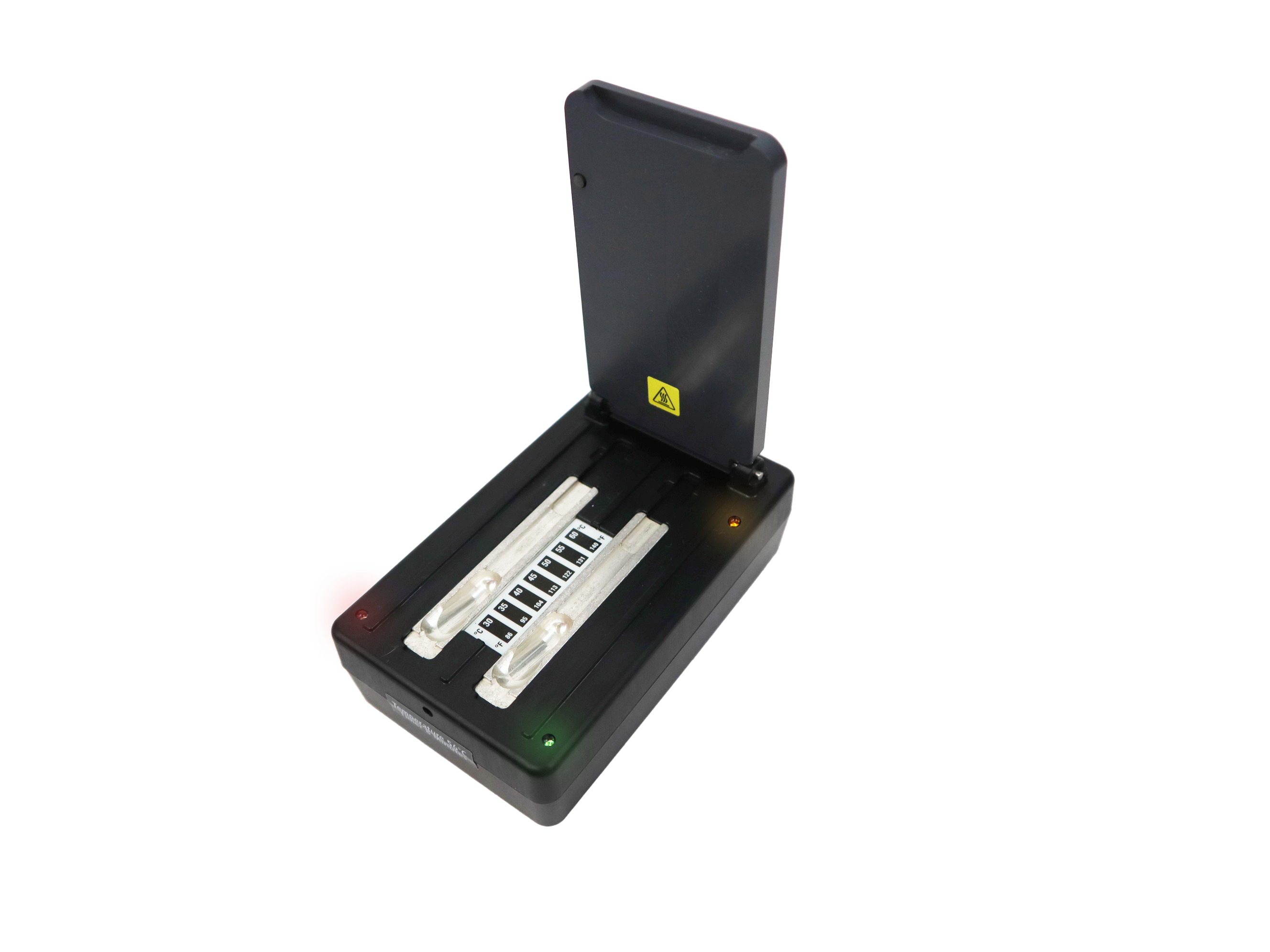 Zodra de incubator is ingeschakeld, begint hij op te warmen tot de vooraf ingestelde temperatuur, waarbij het oranje LED-lampje aangeeft dat hij is ingeschakeld en het rode LED-lampje knippert tijdens het opwarmen. Wanneer de temperatuur stabiel is, gaat het groene LED-lampje branden. Door een ROSA-strip in de incubator te plaatsen en het deksel te sluiten, wordt de incubatietimer automatisch gestart. Aan het einde van de incubatieperiode geeft de incubator een duidelijk piepsignaal en knipperen de LED's om aan te geven dat de incubatie is voltooid. Een gedefinieerd post-incubatievenster zorgt ervoor dat de strip op tijd wordt verwijderd om ongeldige tests te voorkoen.