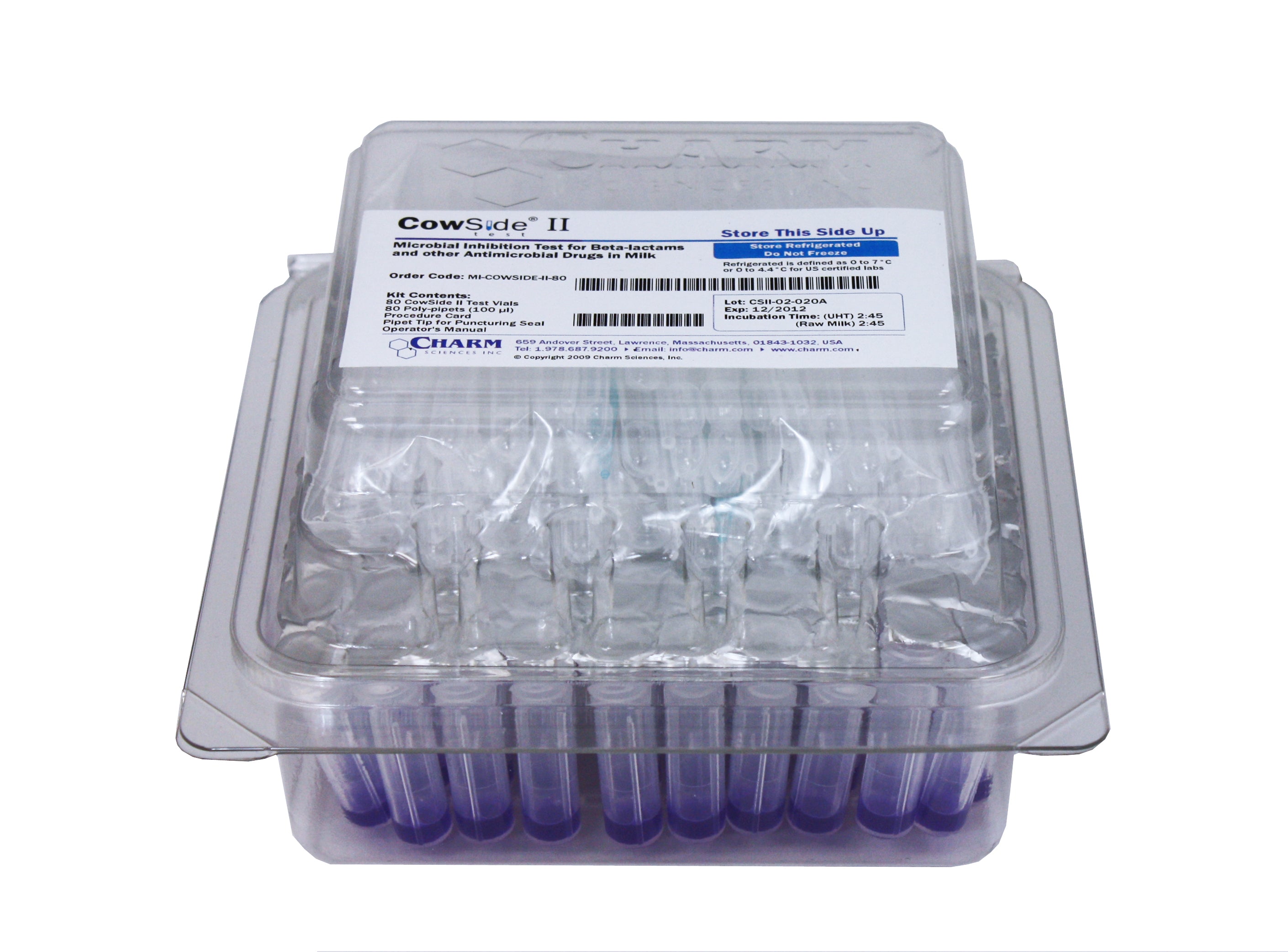 De Charm CowSide II-test is een microbiële remmingstest die is ontworpen voor snelle, eenvoudige en betaalbare screening van koemelk op antibioticaresiduen op de boerderij. De test werkt met rauwe, gepasteuriseerde of ultra-gepasteuriseerde melk, evenals met gereconstitueerde melkpoeder. Door middel van een kleurveranderingreactie wordt de aanwezigheid van antimicrobiële geneesmiddelen die vaak worden gebruikt in de zuivelproductie visueel geïdentificeerd.